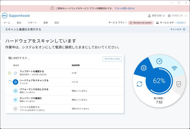 すると、「Support Assist」が・・・、起動後、動かない・・・