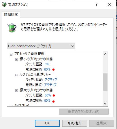 電源オプションから最大値を100%➔80%ほどに 多少は、効果があれば・・・という完全に感覚の世界です?